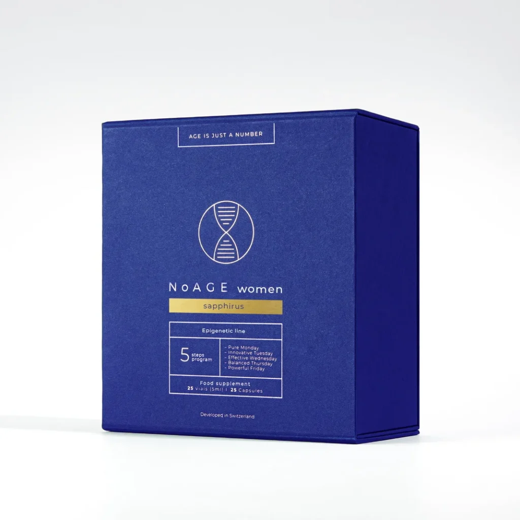 The 5-step beauty and youth programme. NoAGE women sapphirus is an epigenetic, norvatorial biomedical product containing 38 valuable ingredients. For women aged 25 years and over who want to enjoy natural, fadeless beauty.